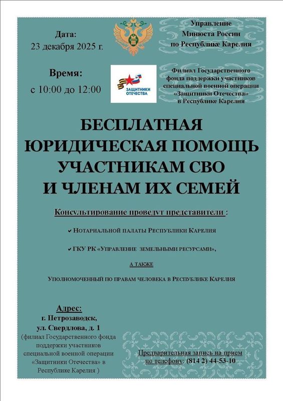 23 декабря 2025 года приму участие в личном приёме участников СВО и членов их семей для оказания бесплатной юридической помощи на площадке филиала фонда «Защитники Отечества» в Республике Карелия.